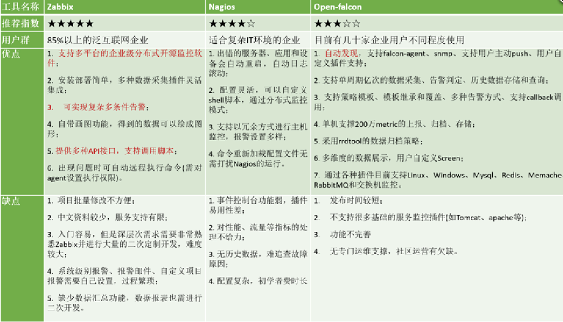 - 小公司/ 创业团队:< 500台服务器规模,开源方案:Zabbix、Nagios、Cacti
